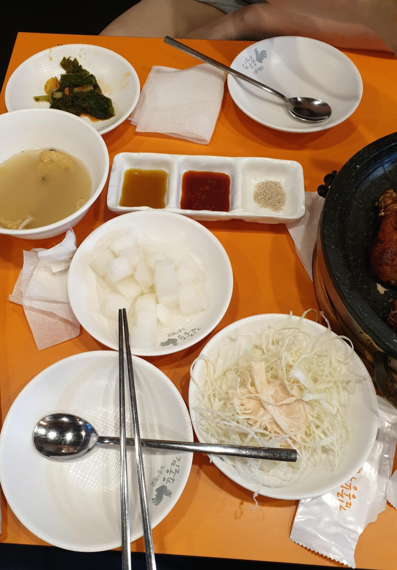 밑반찬은 무~, 소스, 약간의 김치