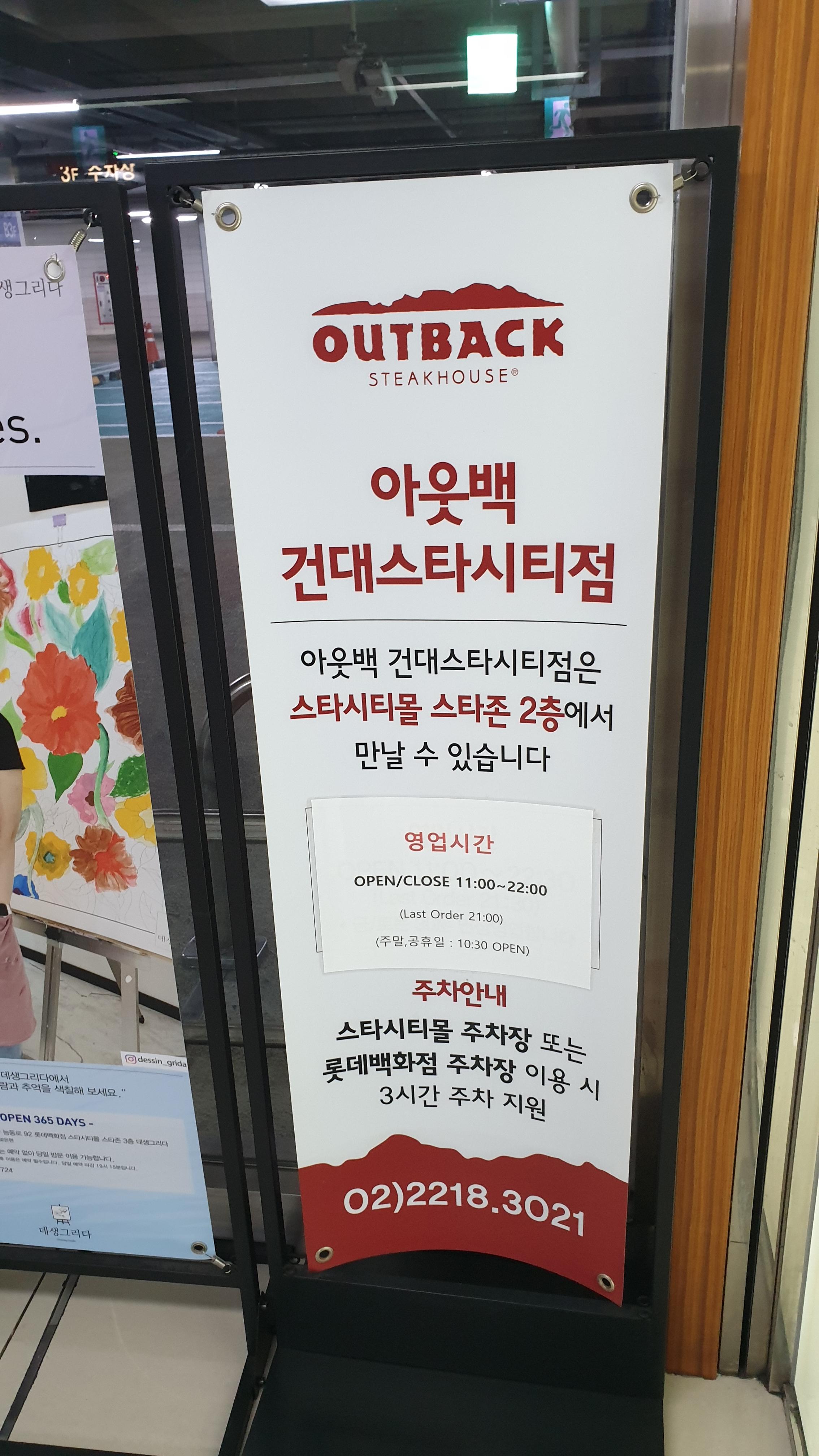 아웃백 건대점은 주차장이 넓기에 백화점 주차게이트로 들어가서 아래기둥근처에 주차하시면 됩니다. 스타시티몰 스타존 2층에 있으므로